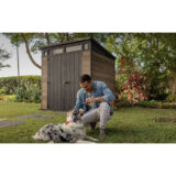 The Keter 7′ x 7′ Walnut Signature Pent Plastic Shed – Walnut Woodlook is modern in every way. With a slanted roof above a band of windows, it boasts a sleek, contemporary design that stores your belongings in eye-catching style.