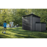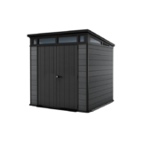 The Keter 7’x 7′ Cortina Heavy Duty Plastic Pent Shed – Dark Grey is modern in every way. With a slanted roof above a band of windows, it boasts a sleek, contemporary design that stores your belongings in eye-catching style. Its double layered walls are made from Evotech, our innovative composite material that gives you the aesthetic look and feel of wood but with the benefits of resin.
