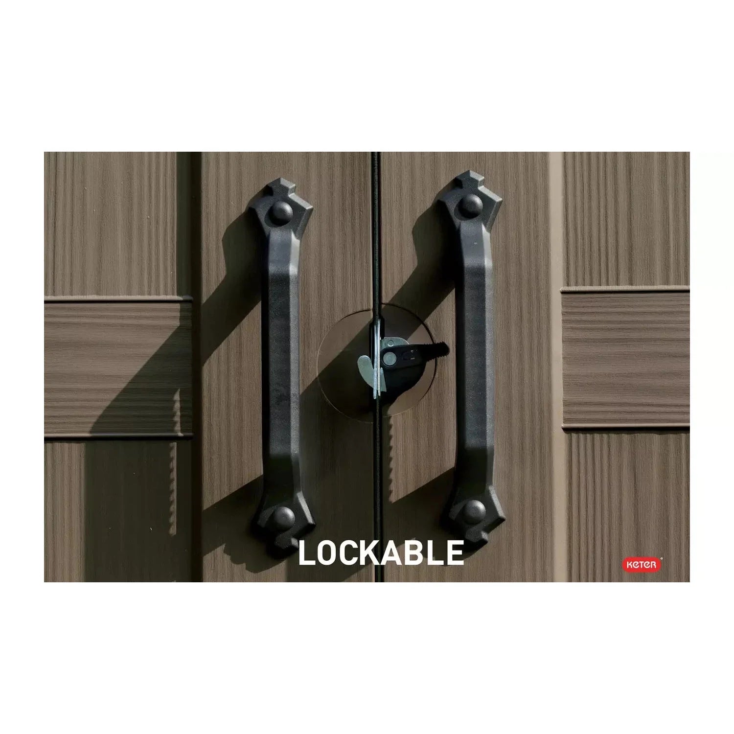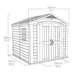 The Factor 8×8 shed gives you ample storage with plenty of convenience. Made from durable weather-resistant resin, this shed won’t rust or rot like wooden sheds, and comes with steel reinforcements for added strength. It features a heavy-duty floor that protects your equipment from water and mud, high-arched double doors that will allow you easy access to the shed contents, and with two shelves are included for instant organized storage. A full-length skylight lets in plenty of natural light, and it’s lockable too, so you can keep your contents safe, day and night.