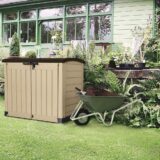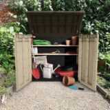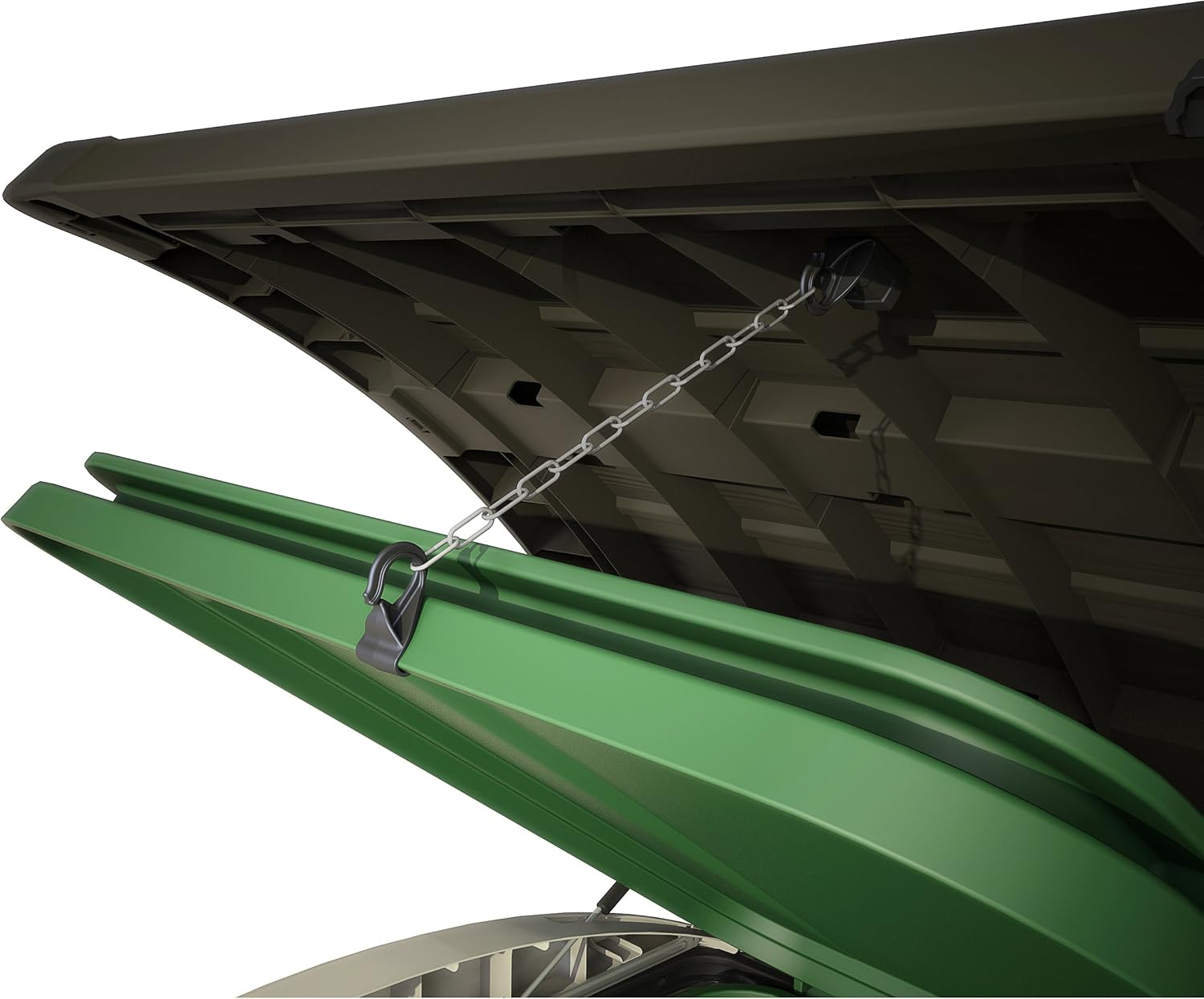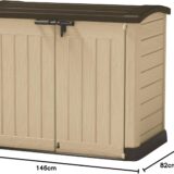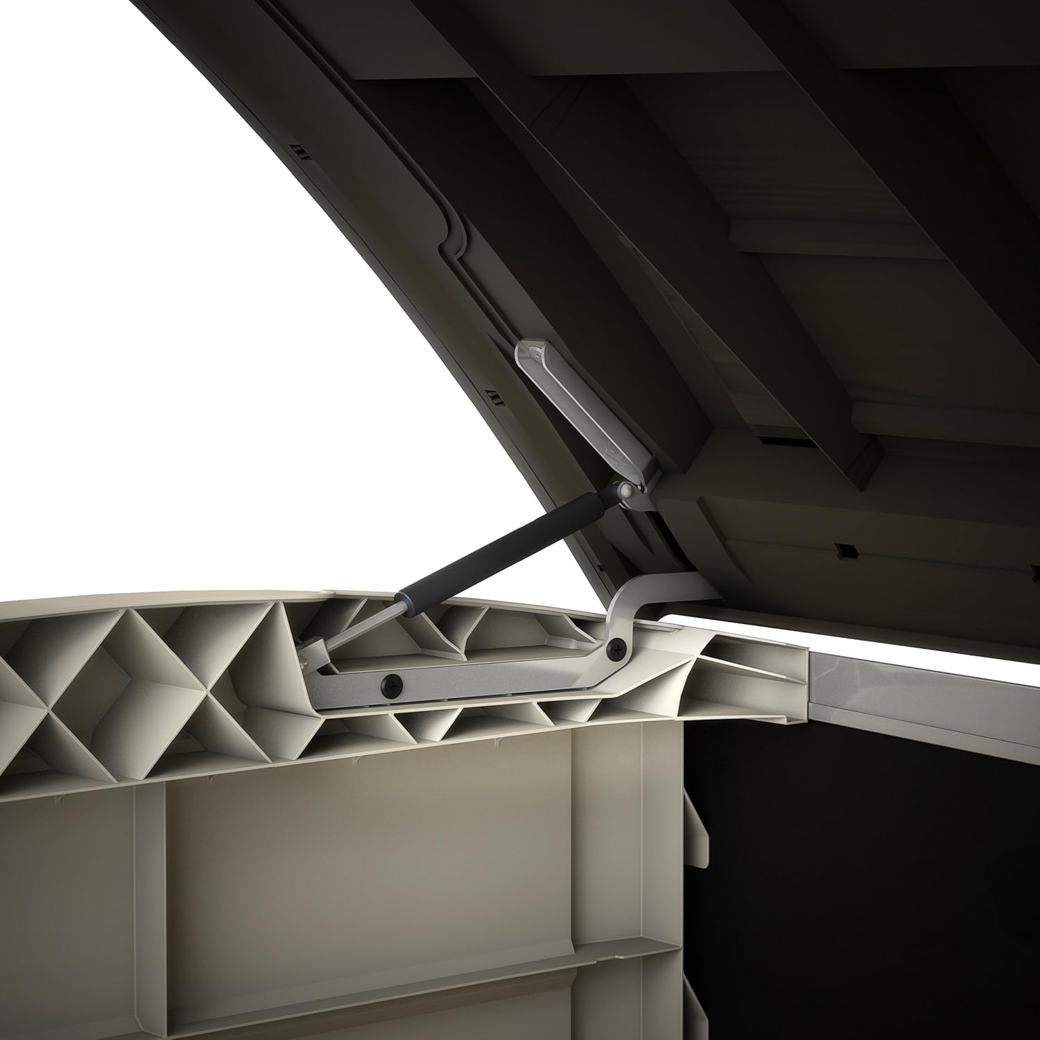 The Store-It-Out ARC is a high-capacity storage shed that provides dry and ventilated storage for up to 1200L of contents. In order to make storage easy it opens from the top or from the front, has an easy-opening lid and a sloped threshold that makes rolling large items in or out simple. With the capacity to hold two 240 L/63 G wheelie bins, there is also a built in shelf support for extra storage options (Shelf not included). This storage bin is easy to assemble and is ideal for storing items ranging from barbecues to lawn furniture.